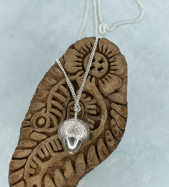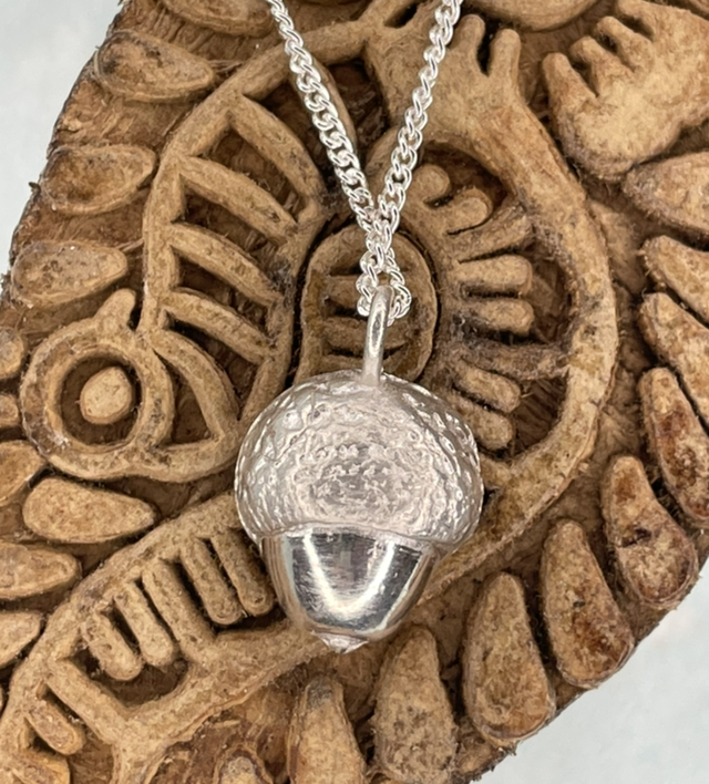 This solid silver acorn is made using a cast I have made from a real acorn. I use silver clay in the mould as it takes the detail of the original acorn really well. Once the clay has dried I use a hand blow torch to fire the clay, burning off the binder and keeping it glowing red hot - this bind the silver molecules forming fine silver. Silver clay is made using recycled silver from the photographic industry. I then clean it up and polish up the acorn but leave the cup more textured.