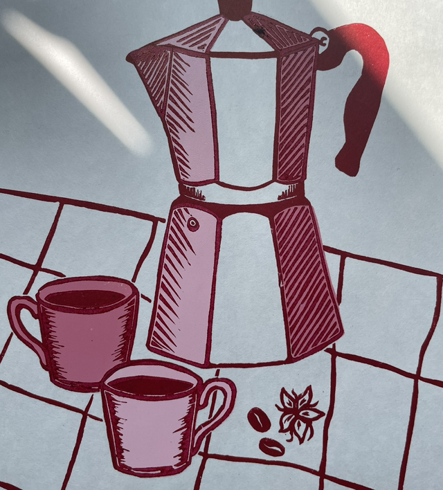 A two layer Lino print of a Moka pot and coffee flowers and beans. This version had the pinks printed first and then the top layer of a deep red on top once dry. It is printed on beautiful Japanese HoSho paper which is off white in colour, the paper is thin but strong.
