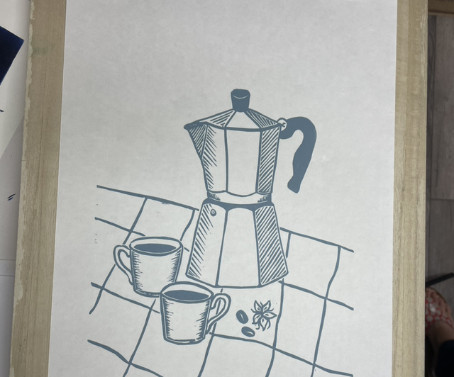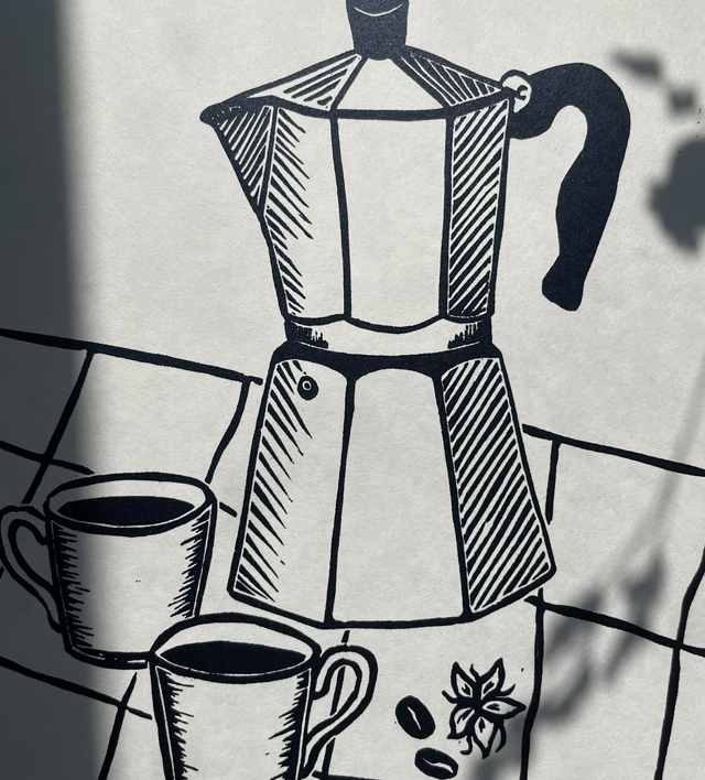 As a coffee lover coffee is a theme that crops up every now and again. This is a newer version of the Moka pot depicting the coffee flowers and beans, this has also been printed on beautiful fine Japanese HoSho paper in either a lovely deep Prussian blue or deep red.
