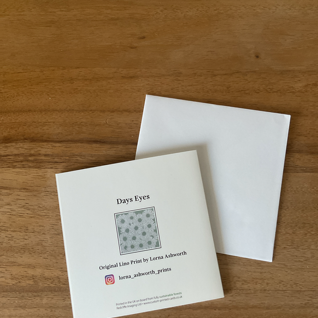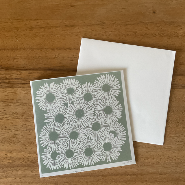 Blank card with reproduction of Days Eyes Lino print in sage green