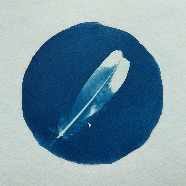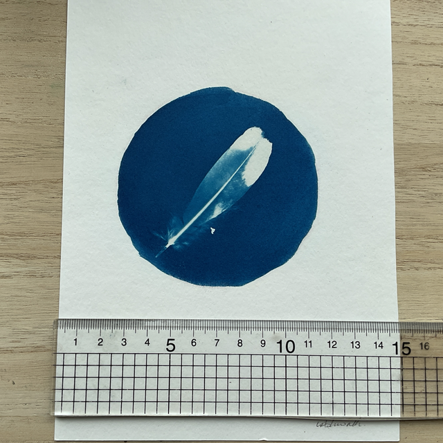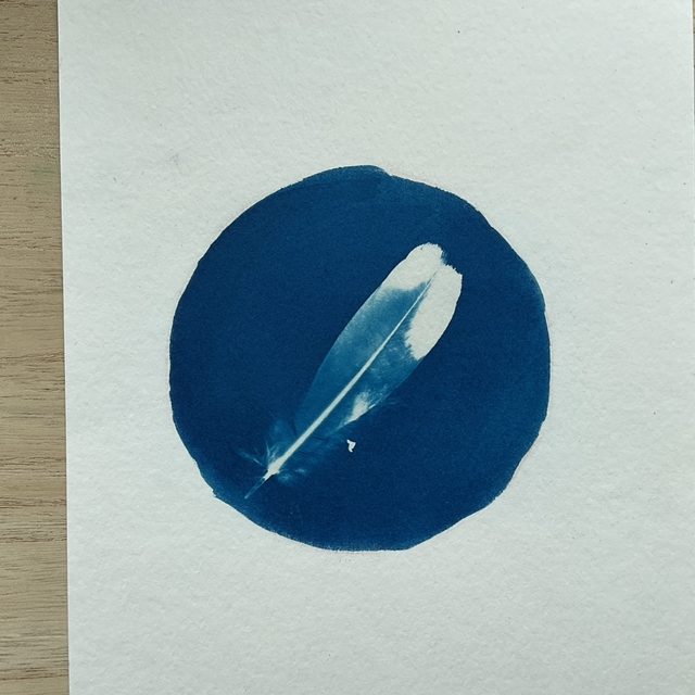 A little feather cyanotype. A circle of deep blue with a feather image in it. Circle part of print is about 9cm