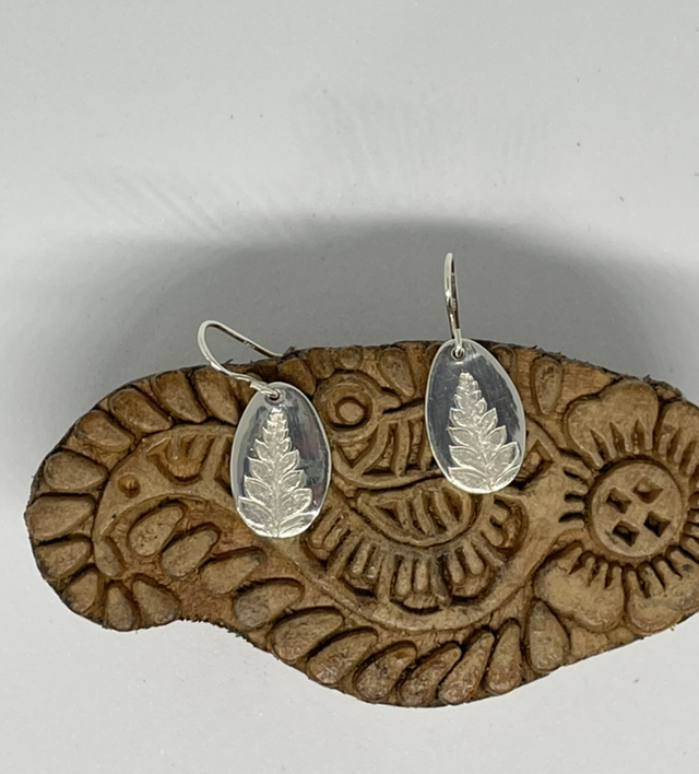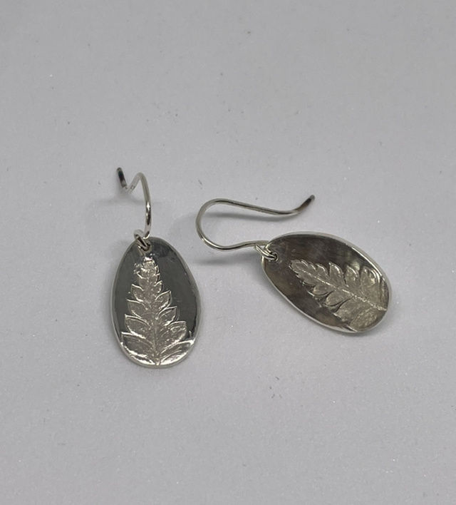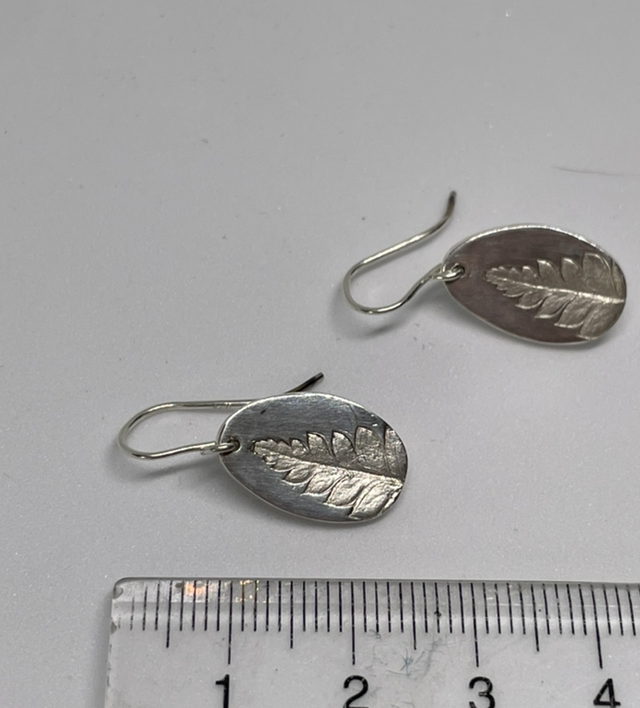 Amazingly detailed Fern leaf impressed silver oval earrings. These earring are a nice size and easy to wear, making a good all occasion earring. These fern leaves are pressed into the silver when it is in clay form taking on all the lovely details of the leaves. Each time these are made a new leaf is used so each pair of earrings are unique.