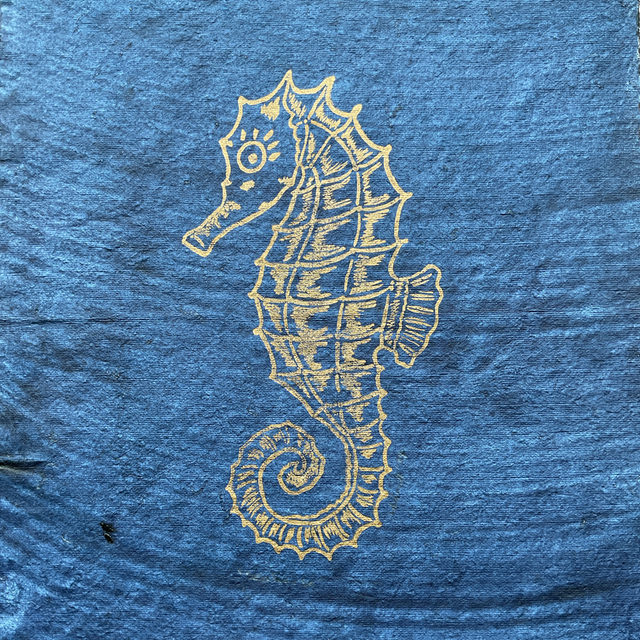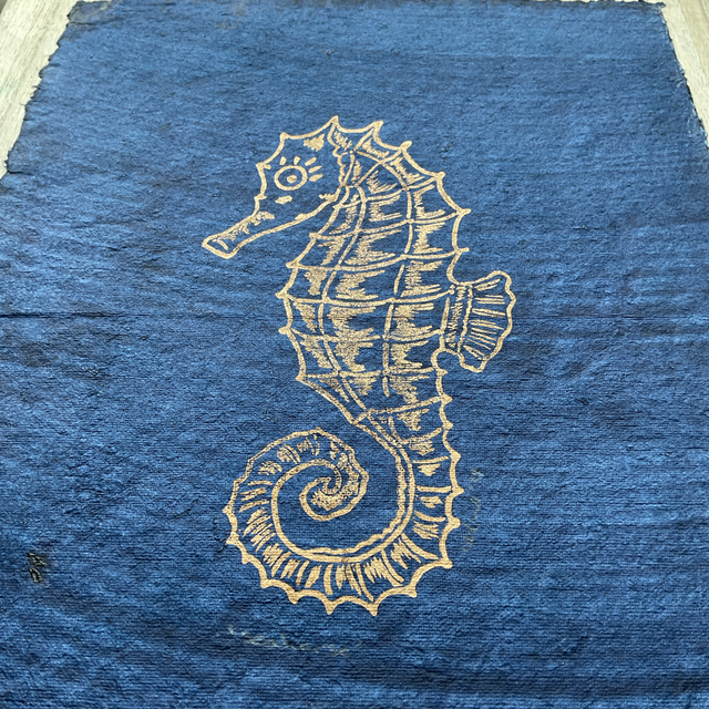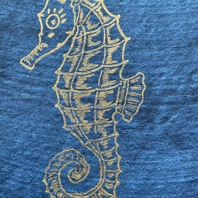 Gold Seahorse on Indigo washed cotton rag paper