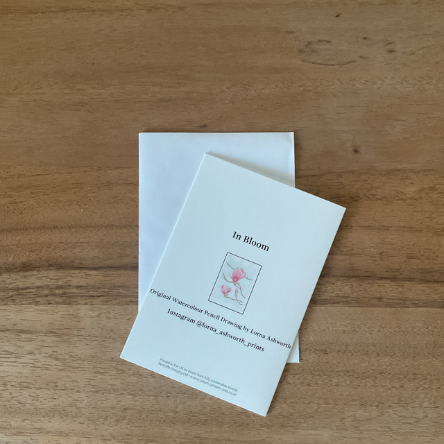Blank card with reproduction of In Bloom pencil drawing of magnolia flowers