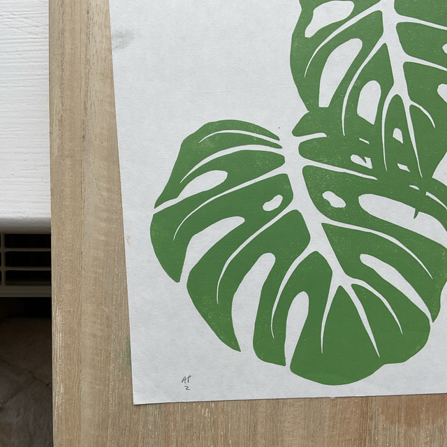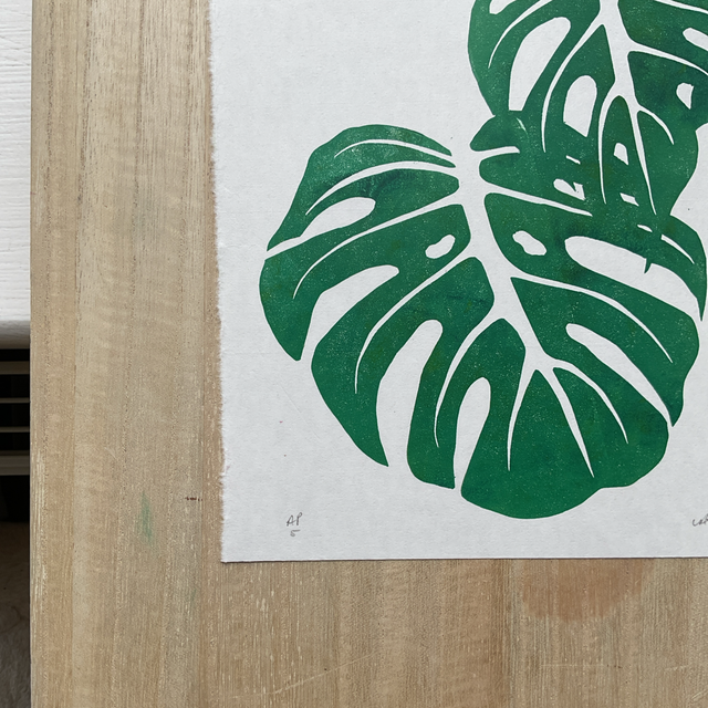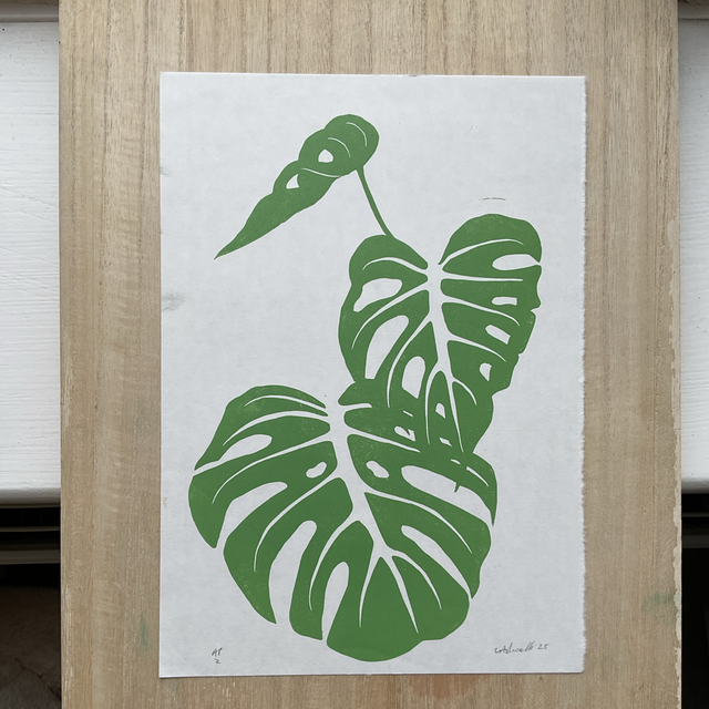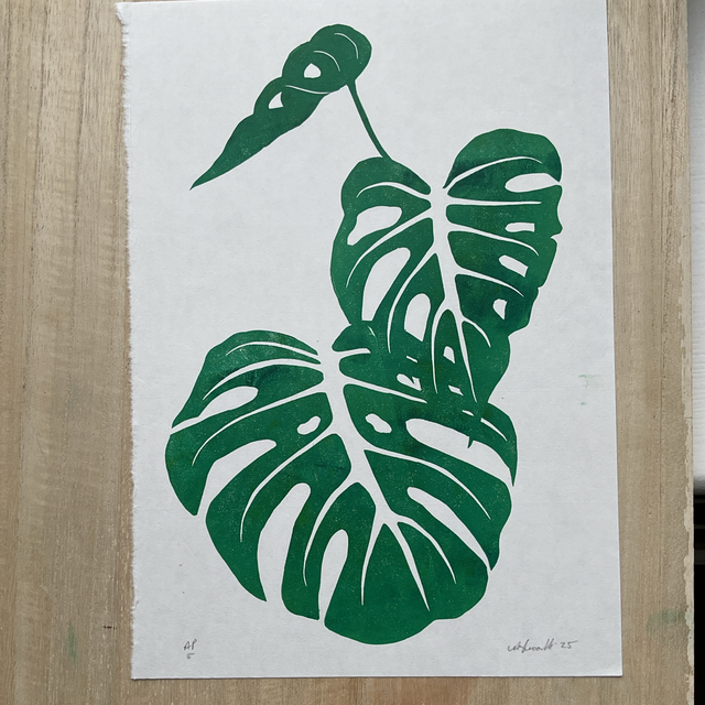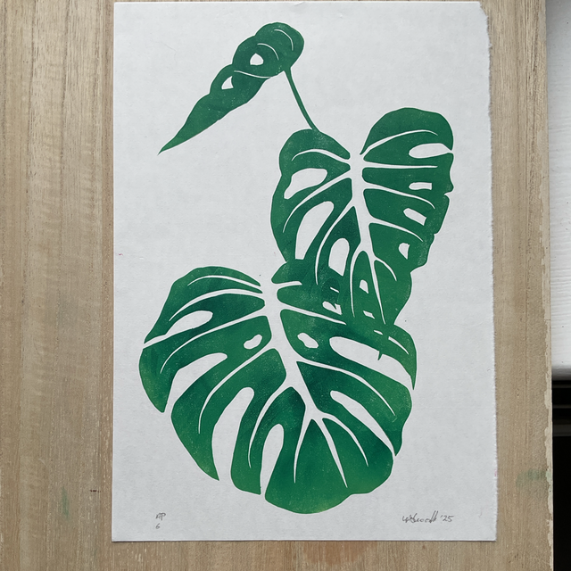 These Artist Prints are a single layer print from my Monstera 4 layer reduction print. This was layer 2 and when I test printed it I liked the resulting image on its own, I then printed a 6, playing with colour mixes and roller textures - for example in print 6 you can clearly see the leaf edge shape printed in the leaf as I used the roller just once that had that impression on it. As the Lino block has now been destroyed in the reduction print process these will not be available again once sold through.