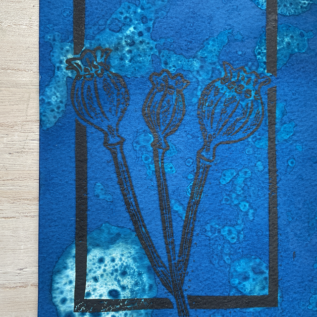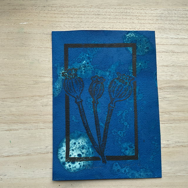 This is version of my Papaver print of poppy seed heads printed in black on a cyanotype background using bubbles. Each print is different as the background is unique each time. A total of 2 prints were made.