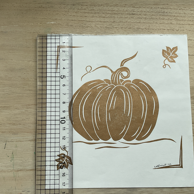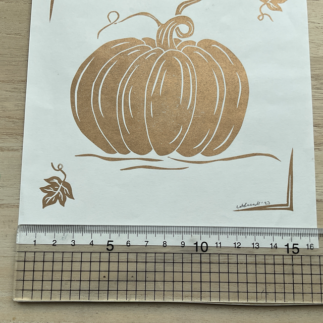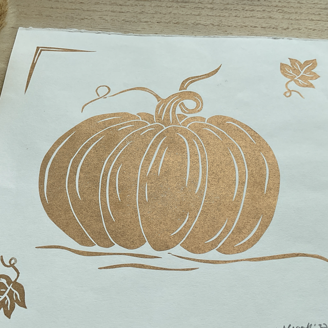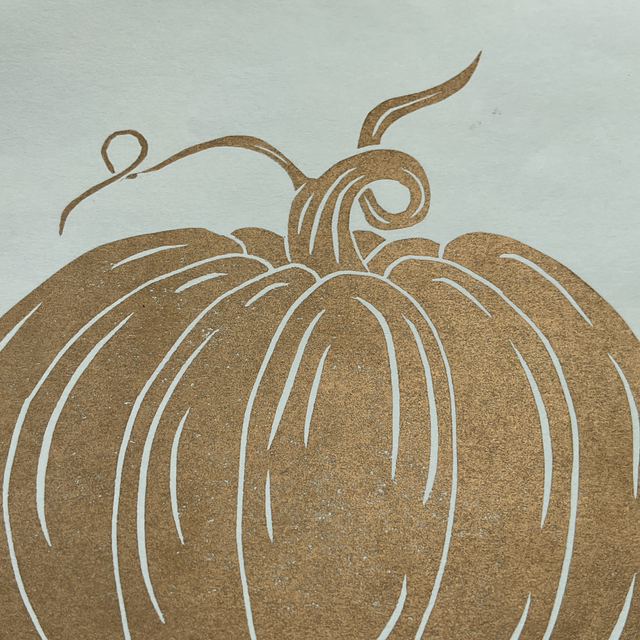 A Lino print of a pumpkin printed in gold ink. There is a shimmer to the ink which is a bit tricky to capture in photos.