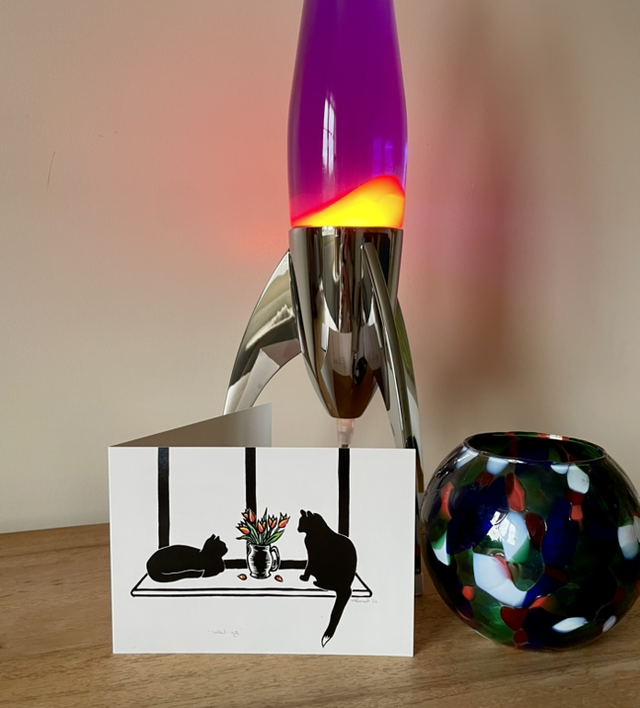 Waiting card from an original Lino print of my cats sitting in the window.