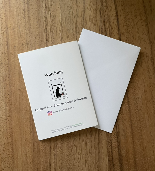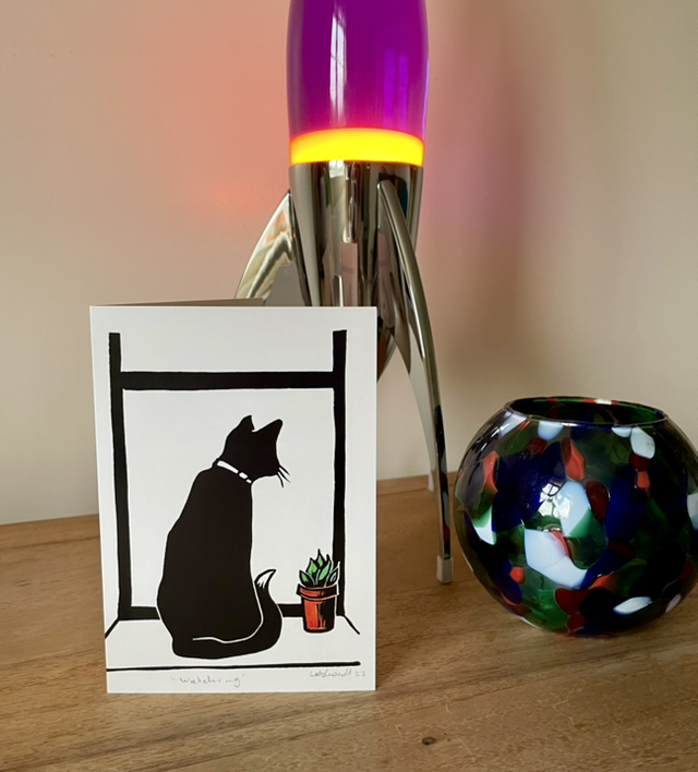 Waiting card from an original Lino print of one of the cats watching birds out the window.